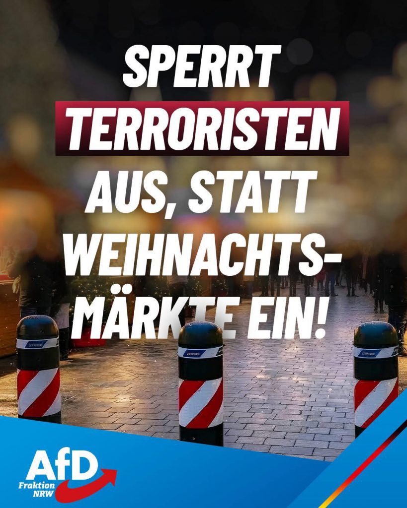 Eine AfD-Regierung wird in aller Konsequenz die Grenzen schützen und gefährliche ausländische Terroristen sowie Gewalttäter aus NRW und Deutschland abschieben, damit Weihnachtsmärkte auch ohne Betonpoller wieder sicher sind. Wir machen Schluss mit der gescheiterten Migrationspolitik der etablierten Fraktionen.“